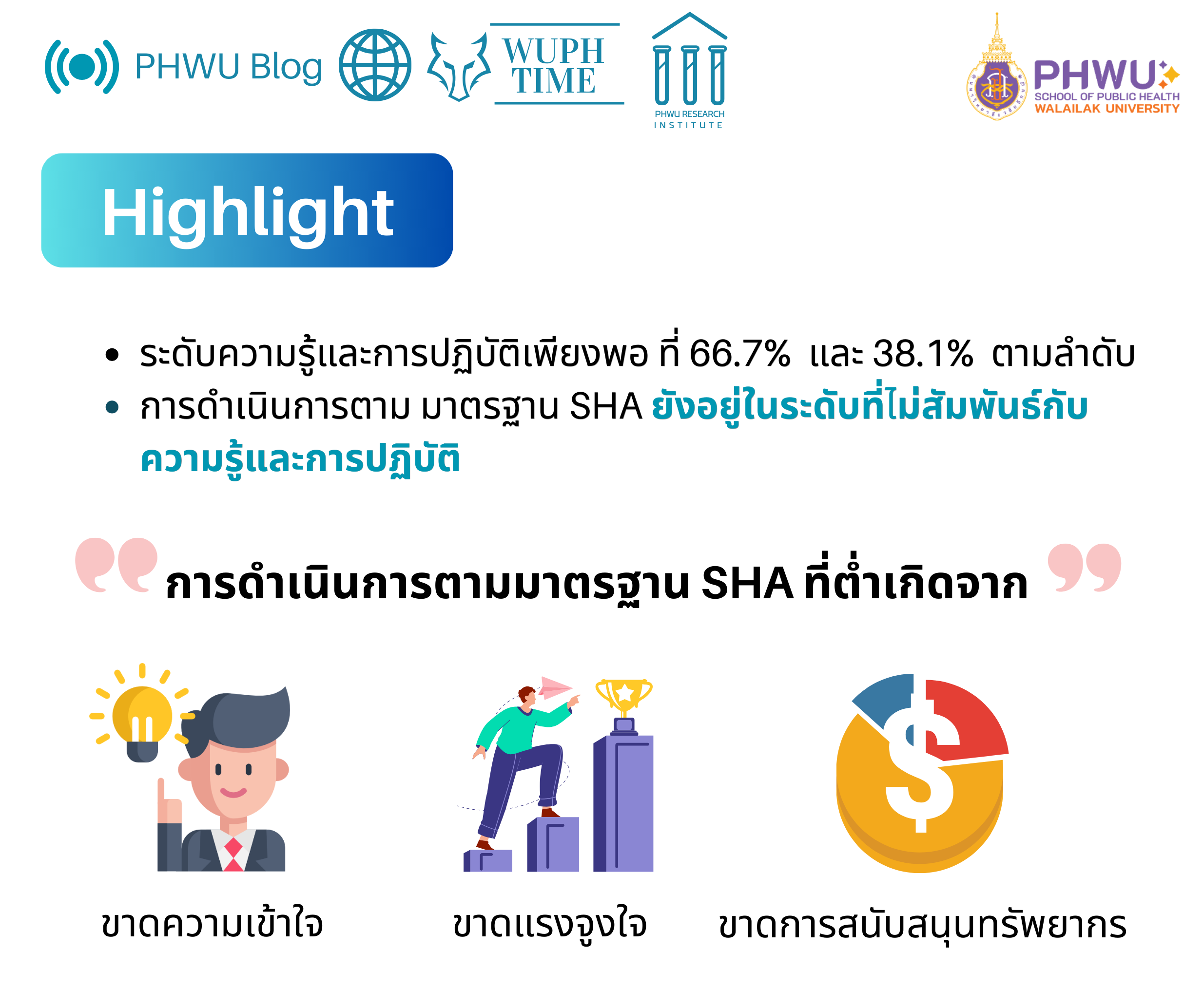งานวิจัยโดย อาจารย์ อภิรักษ์ บำยุทธ ร่วมกับ รองศาสตราจารย์ ดร.ศศิธร ธนะภพ อาจารย์ประจำสำนักวิชาสาธารณสุขศาสตร์ ม.วลัยลักษณ์ และ ดร. Ni Made Utami Dwipayanti จาก Udayana University ประเทศอินโดนีเซีย ได้รับการตีพิมพ์ในวารสาร PLOS ONE วันที่เผยแพร่ผลงาน March 5, 2024 การท่องเที่ยวโดยชุมชน (Community-based tourism; CBT) ในประเทศไทยประสบปัญหาในการปรับตัวให้เข้ากับมาตรการป้องกันโรคโควิด-19 โดยวัตถุประสงค์ของการศึกษานี้คือการประเมินระดับความรู้ การปฏิบัติ และการดำเนินการตามมาตรการด้านความปลอดภัยและสุขภาพของผู้ประกอบการในการจัดการการท่องเที่ยวโดยชุมชนภายใต้มาตรฐาน Amazing Thailand Safety & Health Administration (SHA) ในสถานการณ์ปกติใหม่ (New normal) การศึกษานี้เป็นการศึกษาภาคตัดขวางเชิงพรรณนา โดยทำการศึกษาจากผู้ประกอบการ 21 ราย จากสามสถานที่ท่องเที่ยวโดยชุมชน ในสามอำเภอของจังหวัดนครศรีธรรมราช ในช่วงเดือนกุมภาพันธ์ - พฤษภาคม 2564 ระดับความรู้และการปฏิบัติถูกประเมินโดยใช้แบบสอบถาม และระดับการดำเนินการตามมาตรฐานถูกประเมินโดยใช้แบบประเมินมาตรฐาน SHA โดยการแบ่งระดับความรู้และการปฏิบัติถูกจัดประเภทเป็นเพียงพอและไม่เพียงพอ ในขณะที่การแบ่งระดับการดำเนินการตามมาตรฐานถูกจัดประเภทเป็นสูงหรือต่ำ หากคะแนนเท่ากับหรือเกิน 80% ของคะแนนเต็มในแต่ละด้านตามเกณฑ์ของ Bloom แสดงว่าระดับความรู้และการปฏิบัติอยู่ในระดับเพียงพอ และระดับการดำเนินการตามมาตรฐานอยู่ในระดับสูง ในงานวิจัยนี้ได้มีการรวบรวมข้อมูลลักษณะทางสังคมและประชากรของผู้เข้าร่วมในงานวิจัยด้วย สำหรับการวิเคราะห์ทางสถิติใช้การทดสอบ Fisher’s exact test โดยมีระดับความเชื่อมั่น 95% (α < 0.05) ผลการศึกษาพบว่า 66.7% และ 38.1% ของสถานประกอบการในการศึกษามีความรู้เพียงพอ (ค่าเฉลี่ย ± ส่วนเบี่ยงเบนมาตรฐาน: 46.9 ± 7.2, ค่าสูงสุด: 55.0, ค่าต่ำสุด: 33.0) และการปฏิบัติที่เพียงพอ (ค่าเฉลี่ย ± ส่วนเบี่ยงเบนมาตรฐาน: 40.4 ± 9.2, ค่าสูงสุด: 55.0, ค่าต่ำสุด: 29.0) ตามลำดับ นอกจากนี้ การศึกษายังพบว่าระดับความรู้มีความสัมพันธ์อย่างมีนัยสำคัญกับระดับการปฏิบัติที่ค่า p-value เท่ากับ 0.018 อย่างไรก็ตาม ระดับการดำเนินการตามมาตรฐานไม่มีความสัมพันธ์กับความรู้และการปฏิบัติ สรุปได้ว่าระดับการดำเนินการตามมาตรฐานที่ต่ำเกิดจากการขาดความเข้าใจในรายละเอียดของมาตรฐาน SHA ขาดแรงจูงใจในการปฏิบัติตามมาตรฐาน และงบประมาณของสถานประกอบการขนาดเล็กในแหล่งท่องเที่ยวโดยชุมชนสำหรับการยกระดับมาตรฐาน SHA มีค่อนข้างจำกัด ดังนั้นองค์กรที่เกี่ยวข้องควรใช้กลยุทธ์ที่หลากหลายเพื่อส่งเสริมผู้ประกอบการ เช่น การสร้างความร่วมมือและการสนับสนุนทรัพย