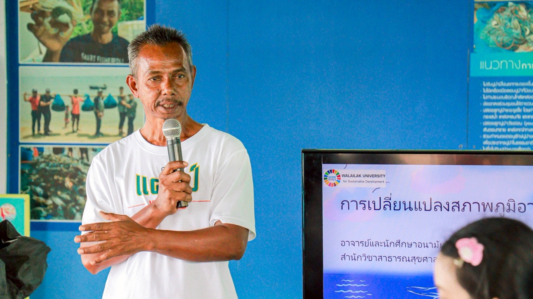 สำนักวิชาสาธารณสุขศาสตร์ มหาวิทยาลัยวลัยลักษณ์ ได้จัดการอบรมและรณรงค์เพื่อสร้างความตระหนักรู้เกี่ยวกับผลกระทบจากการเปลี่ยนแปลงสภาพภูมิอากาศที่มีต่อวิถีชีวิตประมงพื้นบ้านอย่างยั่งยืน ณ ศูนย์เรียนรู้ธนาคารปูม้าและประมงชายฝั่งบ้านในถุ้ง เมื่อวันที่ 25 มิถุนายน 2568 โดยมีกลุ่มเป้าหมายคือประชาชนในชุมชน กิจกรรมครั้งนี้มี ผู้ช่วยศาสตราจารย์ ดร.ปนัดดา พิบูลย์ อาจารย์ประจำสำนักวิชาสาธารณสุขศาสตร์ เป็นแกนนำในการลงพื้นที่พร้อมด้วยนักศึกษาหลักสูตรอนามัยสิ่งแวดล้อม และเจ้าหน้าที่จากศูนย์บริการวิชาการ มหาวิทยาลัยวลัยลักษณ์ กิจกรรมนี้เป็นส่วนหนึ่งของการบูรณาการองค์ความรู้จากมหาวิทยาลัยสู่ชุมชน เพื่อเสริมสร้างความเข้าใจที่ถูกต้อง และกระตุ้นให้เกิดการมีส่วนร่วมในการดูแลสิ่งแวดล้อมอย่างยั่งยืน การจัดกิจกรรมครั้งนี้มุ่งเน้นการให้ความรู้ในประเด็นสำคัญต่าง ๆ ดังนี้: - ผลกระทบจากการเปลี่ยนแปลงสภาพภูมิอากาศ: อธิบายถึงปรากฏการณ์ต่าง ๆ ที่ส่งผลกระทบต่อระบบนิเวศทางทะเลและแหล่งทำมาหากินของชุมชนประมง - ความเสี่ยงที่อาจเกิดขึ้นต่อสุขภาพและสิ่งแวดล้อม: เน้นย้ำถึงภัยคุกคามที่มาพร้อมกับสภาพอากาศที่เปลี่ยนแปลง เช่น การปนเปื้อนในแหล่งน้ำและผลกระทบต่อสุขภาพของประชาชน - แนวทางลดผลกระทบและการปรับตัวในระดับชุมชน: นำเสนอวิธีการปฏิบัติที่เป็นรูปธรรม ซึ่งชุมชนสามารถนำไปปรับใช้ได้จริง เพื่อลดความเสี่ยงและสร้างความยืดหยุ่นในการรับมือกับความเปลี่ยนแปลง กิจกรรมนี้ถือเป็นเวทีที่เปิดโอกาสให้เกิดการแลกเปลี่ยนประสบการณ์ระหว่างนักศึกษาและชุมชน ซึ่งจะช่วยเสริมสร้างความร่วมมืออันดีระหว่างมหาวิทยาลัยกับพื้นที่ และเป็นรากฐานสำคัญในการพัฒนาคุณภาพชีวิตและสิ่งแวดล้อมอย่างยั่งยืนในระยะยาว