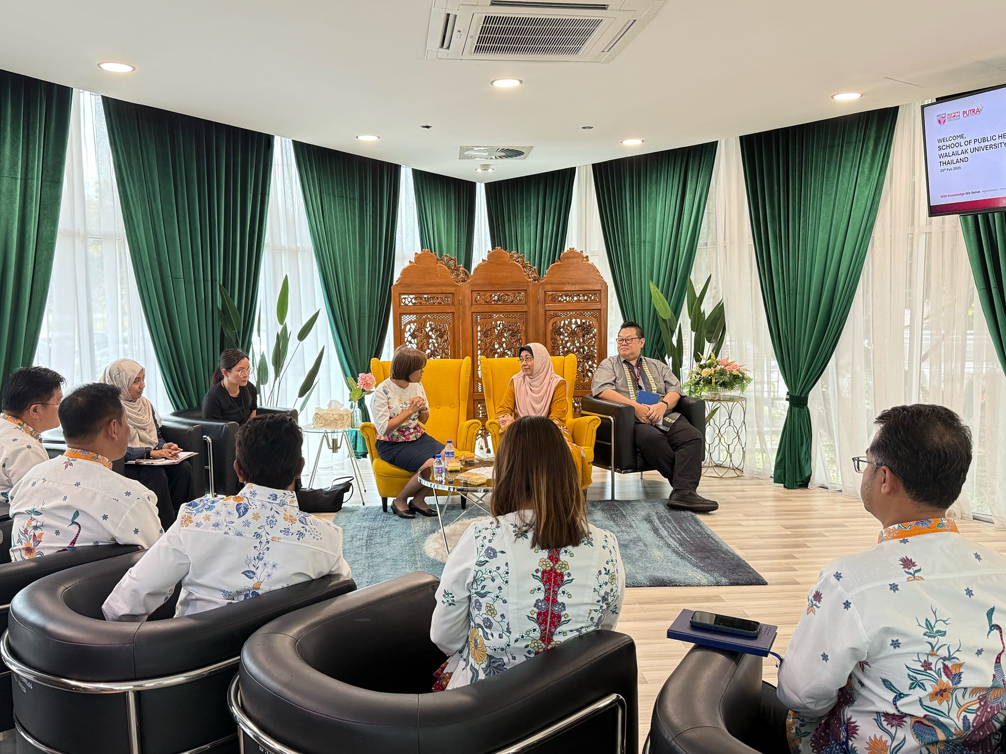 เมื่อวันที่ 25 กุมภาพันธ์ 2568 ผู้ช่วยศาสตราจารย์ ดร.สุภาภรณ์ ยิ้มเที่ยง คณบดีสำนักวิชาสาธารณสุขศาสตร์ มหาวิทยาลัยวลัยลักษณ์ ได้นำคณะผู้บริหารและคณาจารย์เยือน Faculty of Medicine and Health Sciences, Universiti Putra Malaysia (UPM) เพื่อร่วมกิจกรรมแลกเปลี่ยนเรียนรู้ด้านการเรียนการสอน การวิจัย และแนวทางการสร้างความร่วมมือทางวิชาการระหว่างสองสถาบันให้เน้นแฟ้นและเข้มแข็งยิ่งขึ้น ซึ่งการแลกเปลี่ยนในครั้งนี้มีประเด็นที่น่าสนใจหลายอย่าง โดยเฉพาะอย่างยิ่งการดูแลนักศึกษาและกิจการนักศึกษา การเยือนครั้งนี้เป็นจุดเริ่มต้นสำคัญของความร่วมมือระหว่าง PHWU และ UPM โดยเปิดโอกาสให้ทั้งสองฝ่ายได้เรียนรู้ร่วมกัน และวางรากฐานสำหรับการดำเนินงานด้านวิจัยร่วม การแลกเปลี่ยนบุคลากร และความร่วมมือทางวิชาการในสาขาสาธารณสุขศาสตร์และวิทยาศาสตร์การแพทย์ในอนาคต ซึ่งต่อยอดจากความสัมพันธ์ที่มีกันมาอย่างยาวนาน ทั้งด้านการวิจัยด้าน Ergonomic และการส่งนักศึกษามาฝึกสหกิจศึกษา ณ Hospital Sultan Abdul Aziz Shah ซึ่งเป็นโรงพยาบาลภายใต้ Faculty of Medicine and Health Sciences ให้เข้มแข็งและครอบคลุมมากยิ่งขึ้น