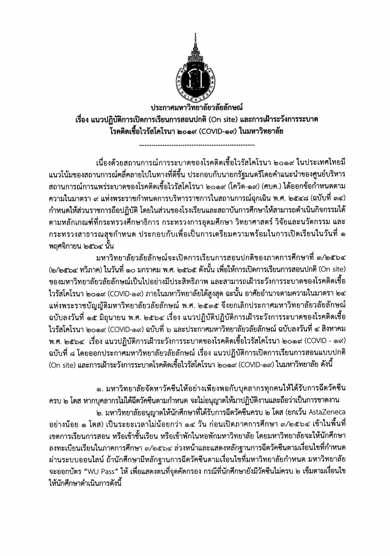 เรื่อง แนวปฏิบัติการเปิดการเรียนการสอนปกติ (On site) และการเฝ้าระวังการระบาดโรคติดต่อเชื้อไวรัสโคโรน่า 2019 (COVID-19) ในมหาวิทยาลัย