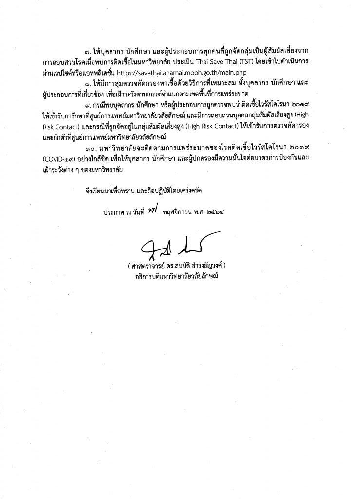 เรื่อง แนวปฏิบัติการเปิดการเรียนการสอนปกติ (On site) และการเฝ้าระวังการระบาดโรคติดต่อเชื้อไวรัสโคโรน่า 2019 (COVID-19) ในมหาวิทยาลัย