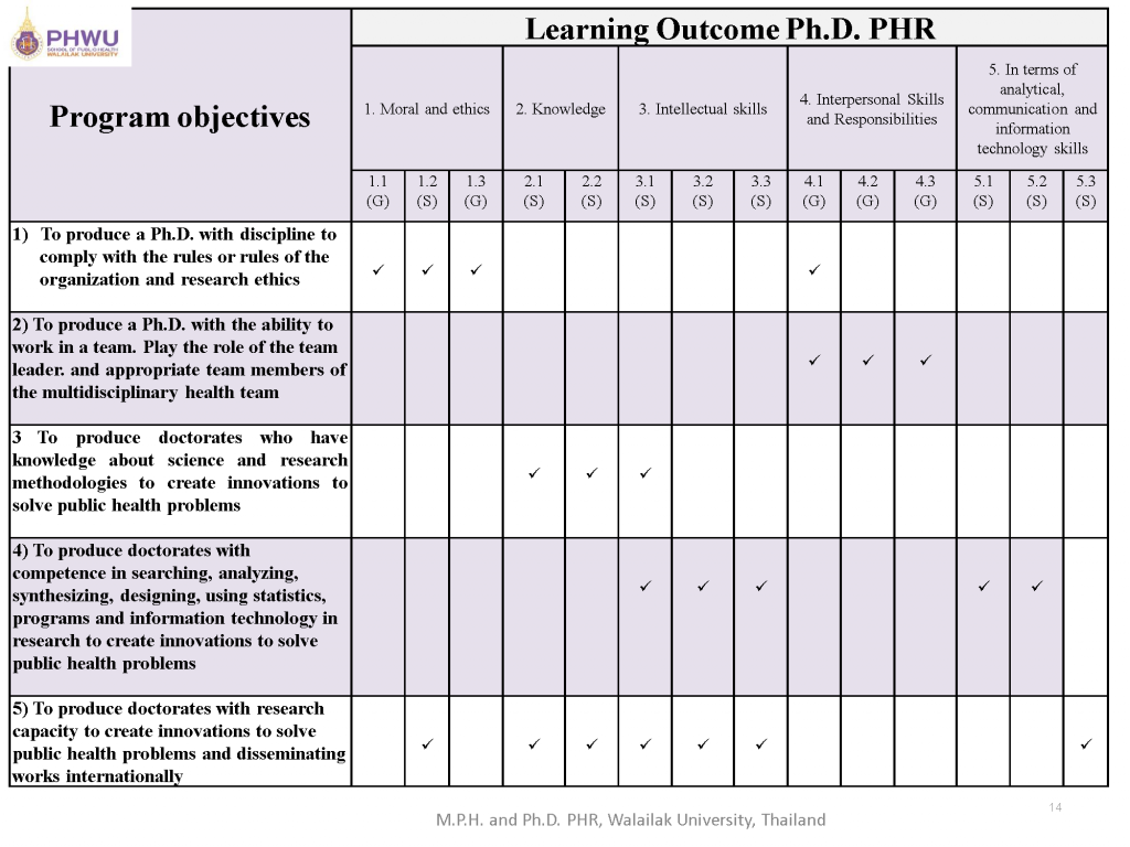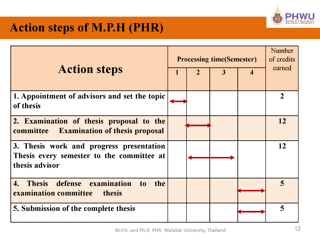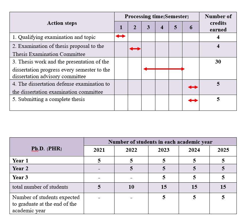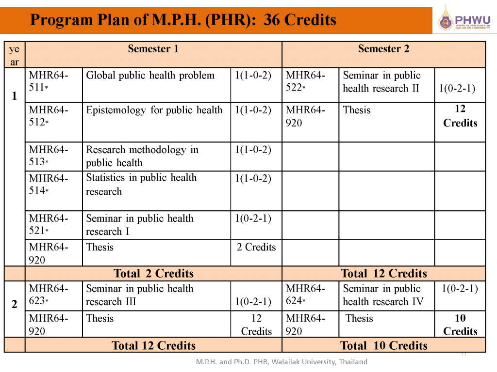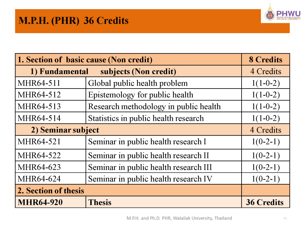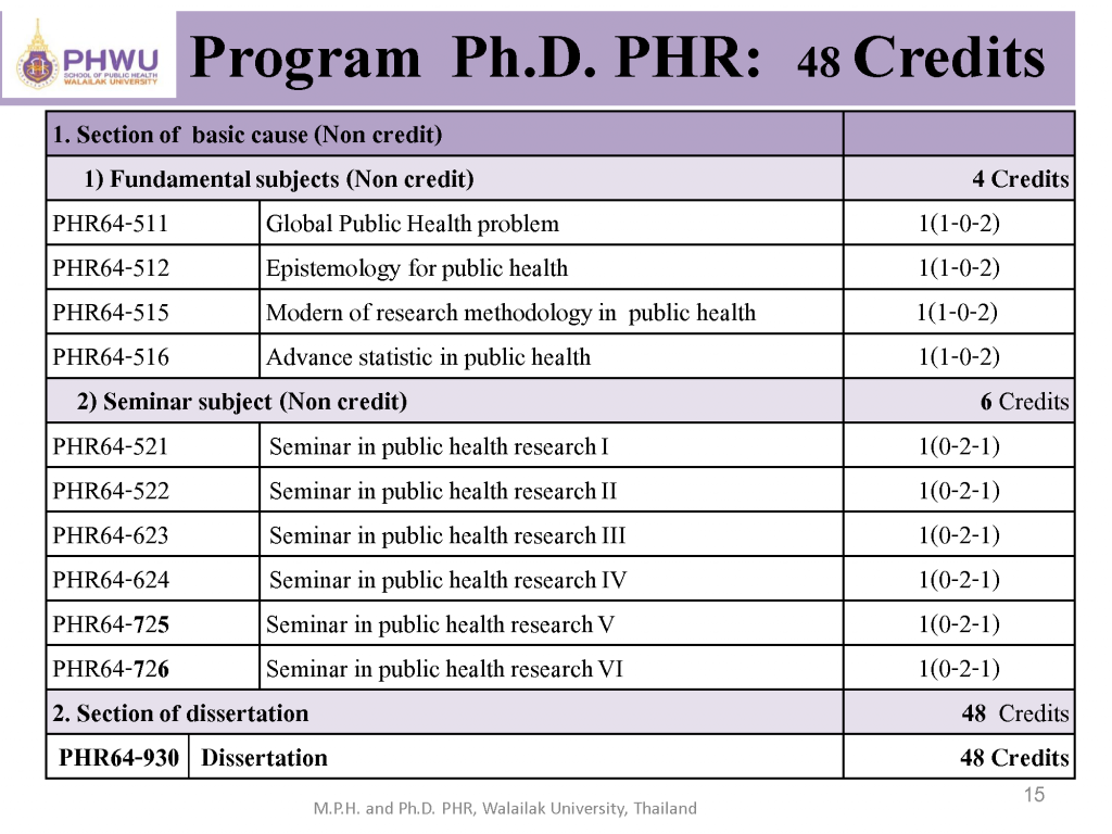 1. Compulsory subjects 10* Credits 1) Fundamentals 4* Credits 2) Seminars 6* Credits 2. Thesis/Dissertation 48 Credits 1. Section of basic cause (Non credit) 1) Introduction subject 4 Credits PHR64-511 Global Public Health problem 1(1-0-2) PHR64-512 Epistemology for public health 1(1-0-2) PHR64-515 Modern of research methodology in public health 1(1-0-2) PHR64-516 Advance statistic in public health 1(1-0-2) 2) Seminar subject (Non credit) 6 Credits PHR64-521 Seminar in public health research I 1(0-2-1) PHR64-522 Seminar in public health research II 1(0-2-1) PHR64-623 Seminar in public health research III 1(0-2-1) PHR64-624 Seminar in public health research IV 1(0-2-1) PHR64-725 Seminar in public health research V 1(0-2-1) PHR64-726 Seminar in public health research VI 1(0-2-1) 2. Section of dissertation 48 Credits PHR64–930 Dissertation 48 Credits