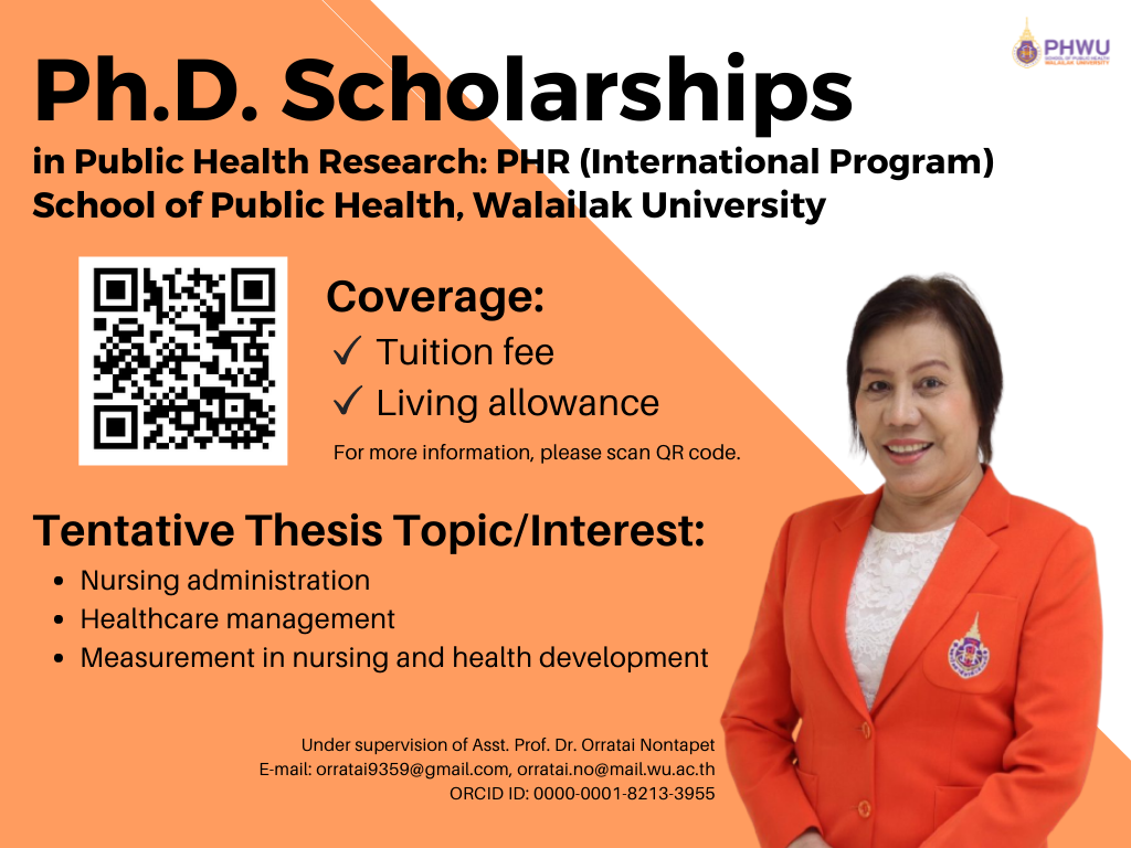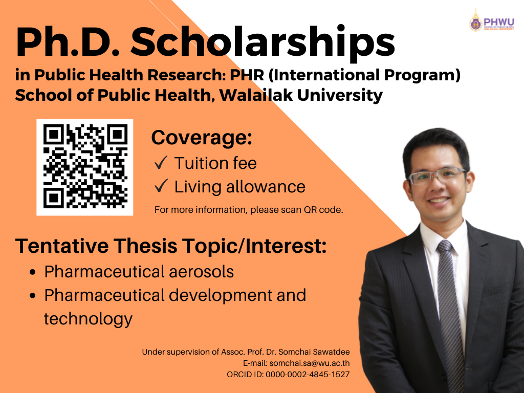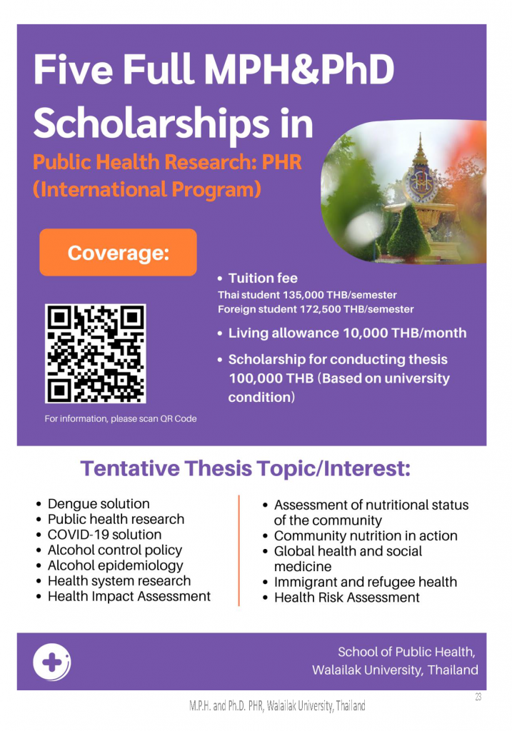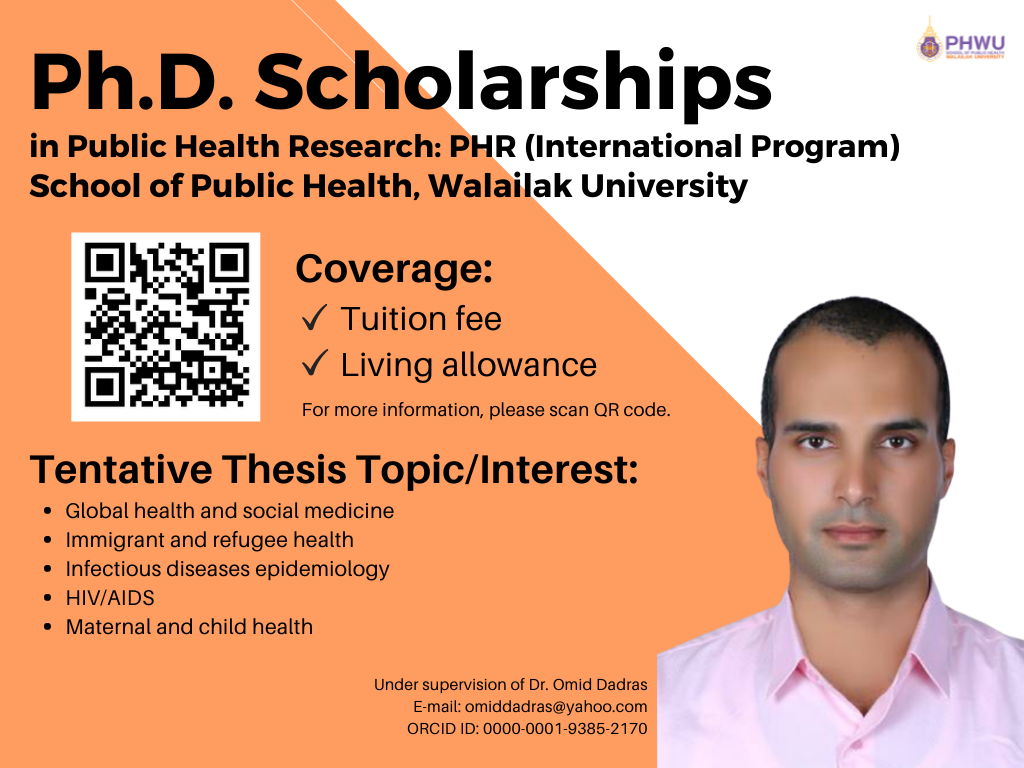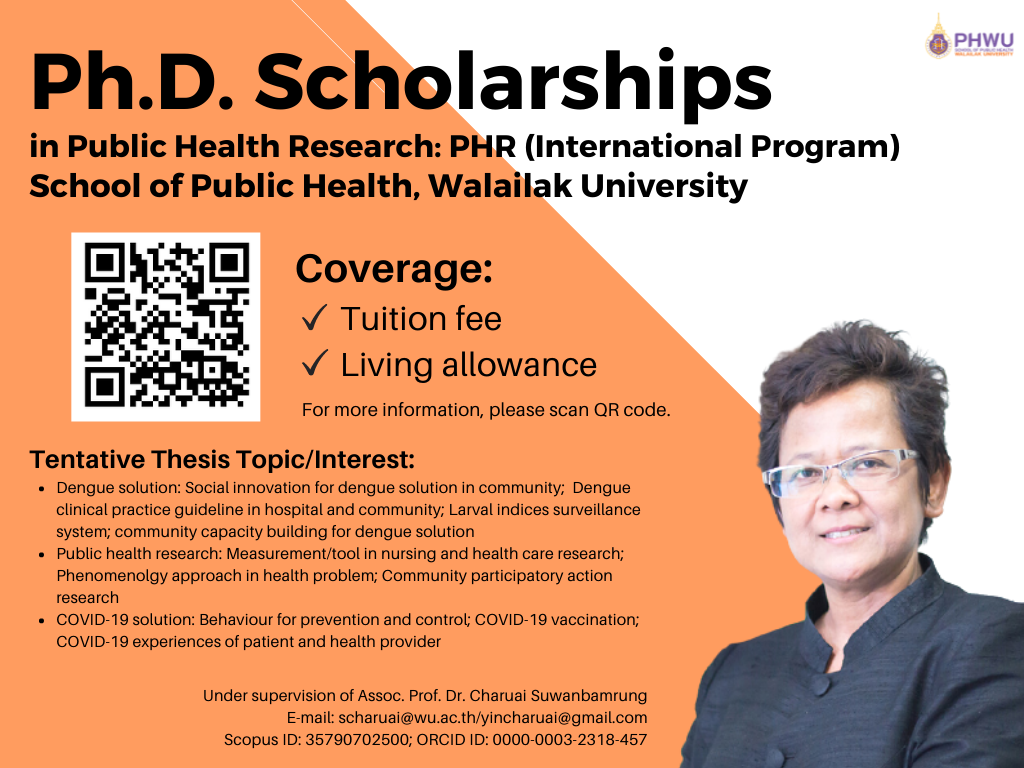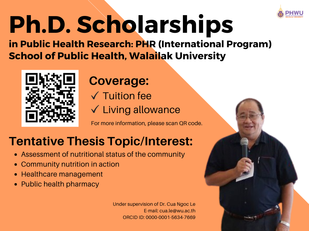 This scholarship is offered by Doctor of Philosophy Program in Public Health Research (International Program), School of Public Health, Walailak University.