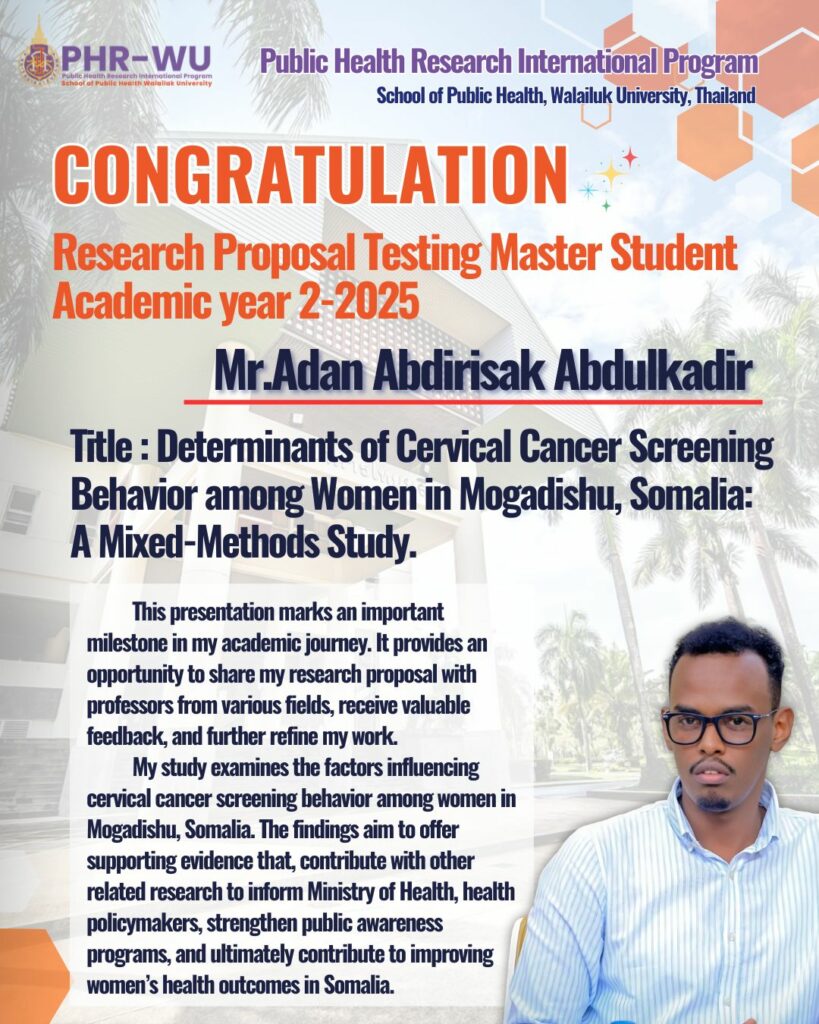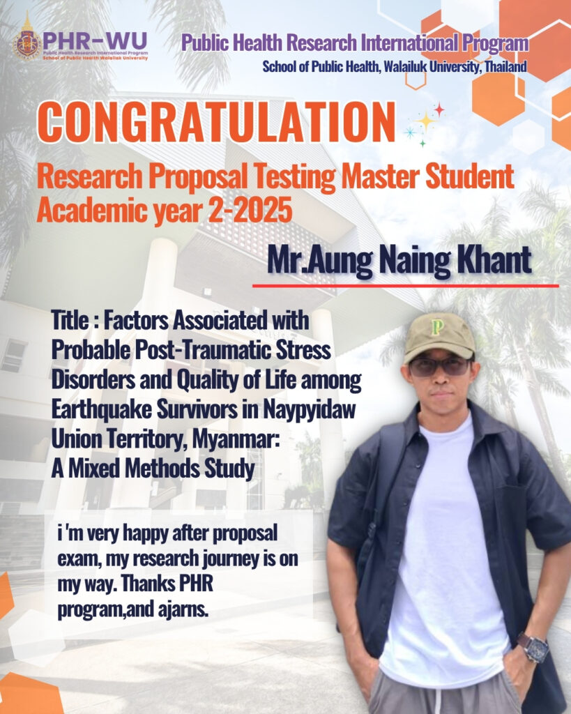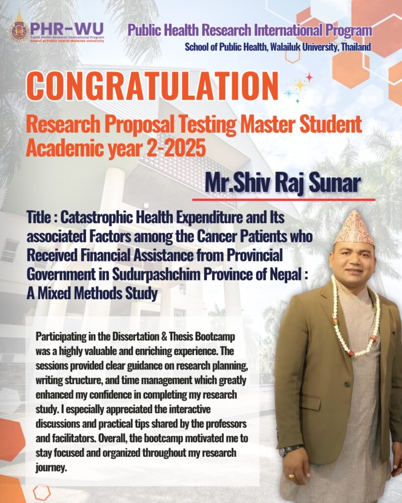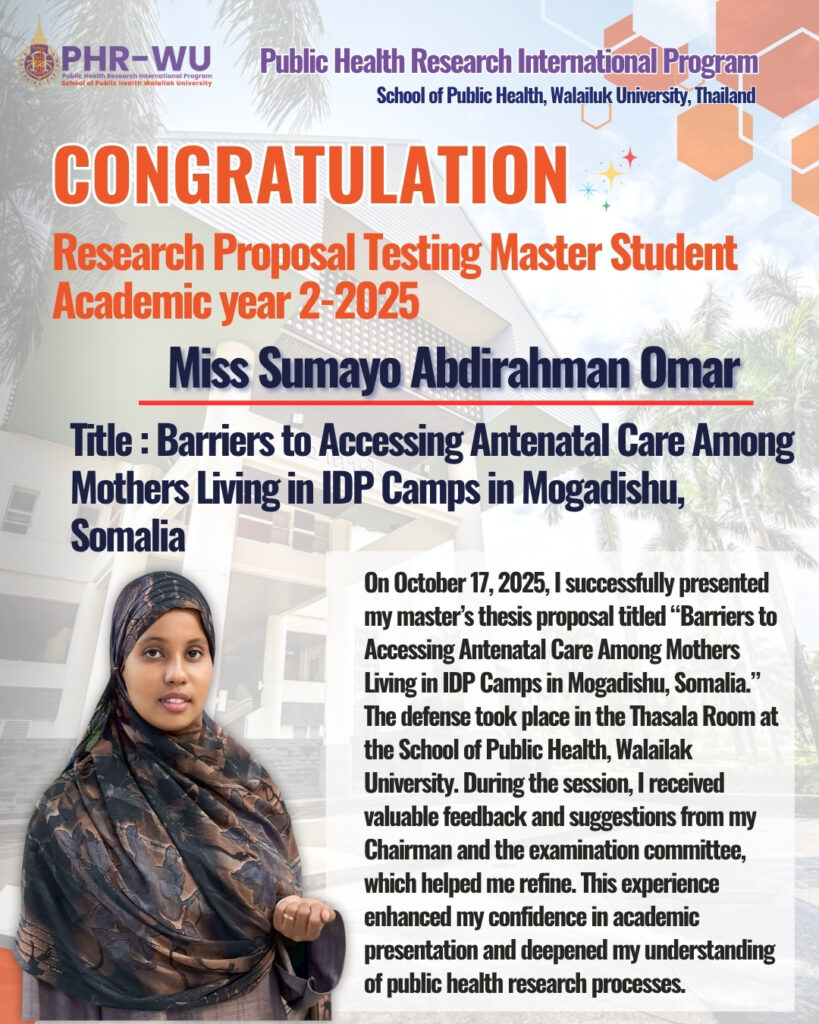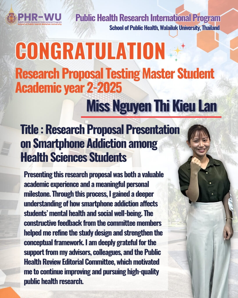 Congratulations to Master of Public Health Research (PHR) Students! Congratulations to all Master of Public Health Research (PHR) students who have successfully completed their Research Proposal Testing, held between 15–17 October 2025 at Walailak University. This accomplishment reflects your hard work, dedication, and determination to advance in the field of public health research. May this