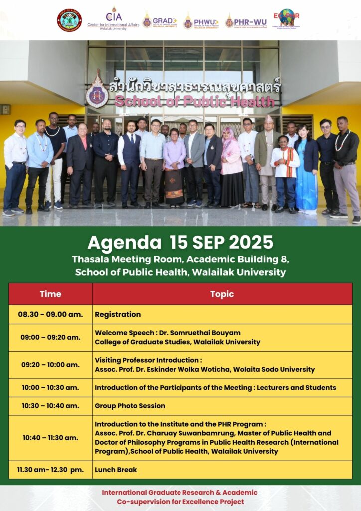 🌍 Walailak University Welcomes Visiting Professor – Day 1 On 15 September 2025, Walailak University officially launched the WU IGRACE Project 2025: Visiting Professor Program at the Thasala Meeting Room, Academic Building 8, School of Public Health. The event was honored by the presence of Assoc. Prof. Dr. Eskinder Wolka Woticha from Wolaita Sodo University,