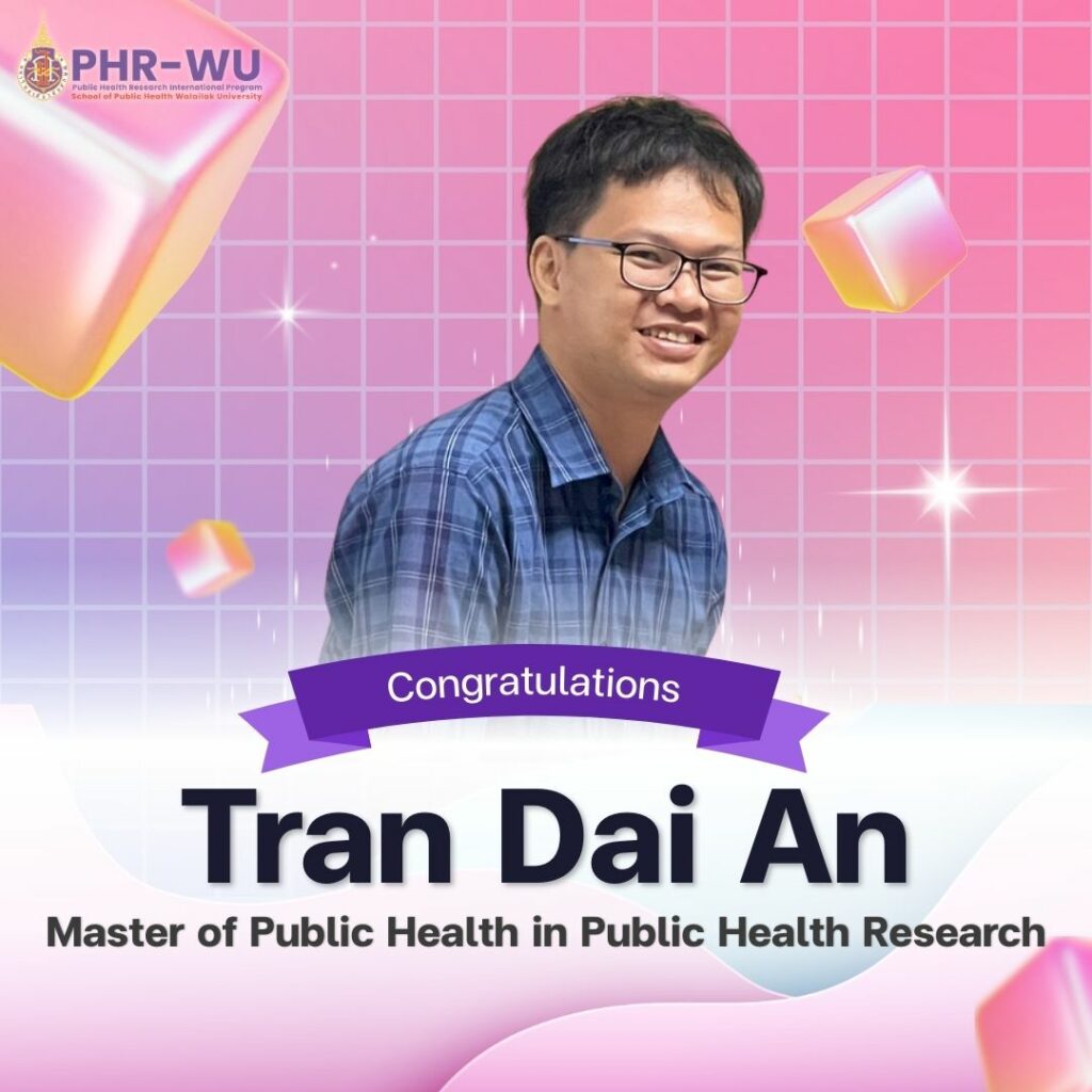 The School of Public Health, Walailak University proudly congratulates Mr. An Dai Tran, a graduate of the Master of Public Health Program in Public Health Research (International Program), on his successful completion of the program. This achievement marks a significant milestone and reflects his dedication, perseverance, and academic excellence. We are confident that the knowledge